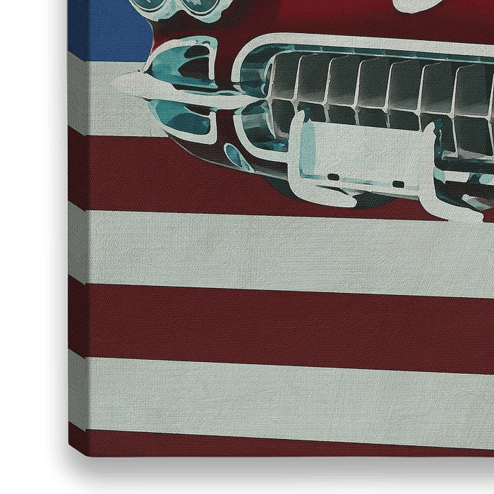 Bestelle dieses Popart-Wandbild Chevrolet Corvette C1 von 1960 vor der amerikanischen Flagge von Jan Keteleer als Reproduktion auf Leinwand, Alu-Dibond, als Poster, Fototapete oder Acrylglasbild.