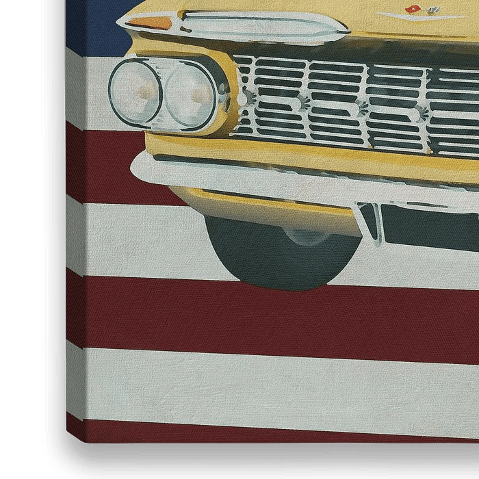 Bestelle dieses Popart-Wandbild Chevrolet Impala 1959 mit Flagge der U.S.A. von Jan Keteleer als Reproduktion auf Leinwand, Alu-Dibond, als Poster, Fototapete oder Acrylglasbild.
