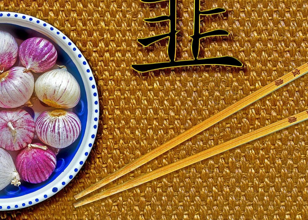 Knollen von chinesischem Knoblauch in einer Porzellanschüssel und hölzerne Essstäbchen