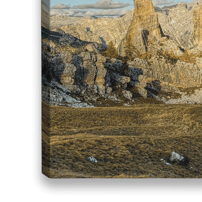 Bestelle dieses Landschafts-Wandbild Cinque Torri im Abendlicht von Michael Valjak als Reproduktion auf Leinwand, Alu-Dibond, als Poster, Fototapete oder Acrylglasbild.