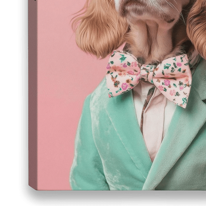 Ein charmantes Bildelement voller Persönlichkeit: der Clumber Spaniel sitzt majestätisch in einem pastellfarbenen Anzug, mit einer floralen Fliege und coolen Sonnenbrillen. Seine sanften, liebevollen Augen und die elegant geschwungenen Ohren strahlen einen unnachahmlichen Stil aus, während der Hintergrund in einem zarten Rosa zu seiner…