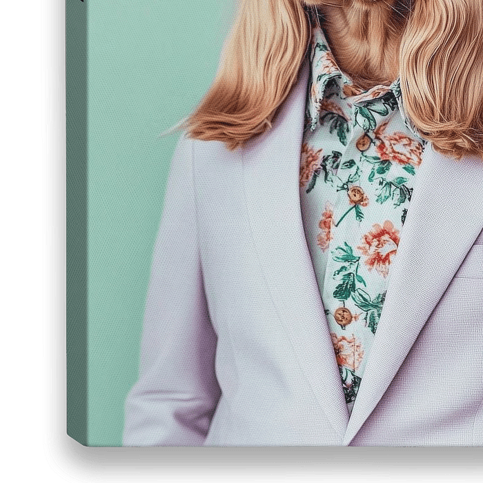 Eleganz in jedem Detail – dieser Cocker Spaniel strahlt durch seine lange, seidige Mähne und den schicken, hellvioletten Anzug. Mit einem Hut, der ihm ein gewisses Je ne sais quoi verleiht, steht er meisterhaft im Rampenlicht. Das florale Hemd unterstreicht seinen stilvollen Auftritt und macht ihn zum Glanzstück jeder Veranstaltung.