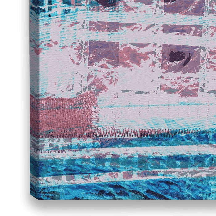 Bestelle dieses abstrakte Wandbild Collage Karo - Streifen Türkis Lila von Claudia Gründler als Reproduktion auf Leinwand, Alu-Dibond, als Poster, Fototapete oder Acrylglasbild.