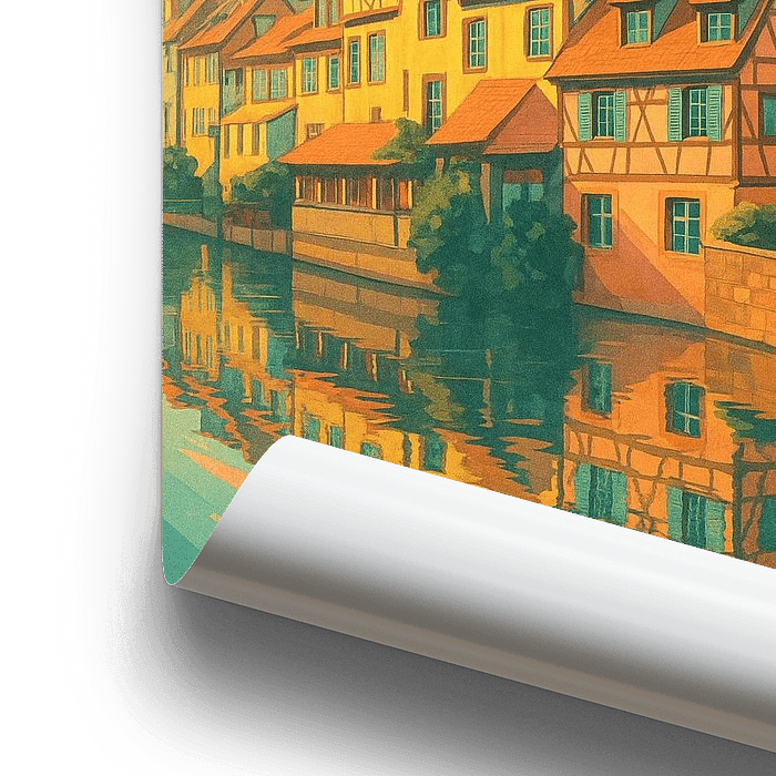 Dieses Art-Déco-Reiseplakat von Colmar fängt den Charme des Elsass mit seinen farbenfrohen Fachwerkhäusern ein, die sich im ruhigen Wasser des Kanals spiegeln. Die warme Farbpalette aus Gelb-, Rot- und Blautönen bringt die märchenhafte Atmosphäre dieser malerischen französischen Stadt zum Ausdruck, während strahlende Lichtstrahlen ein nostalgisches Art-déco-Flair schaffen. Colmar, das oft als das "Klein-Venedig" des Elsass bezeichnet wird, ist für seine mittelalterlichen Straßen, seine Weinkultur und seine zeitlose Schönheit bekannt. Dieses Kunstwerk ist eine Hommage an diesen Charme und damit ideal für Reiseliebhaber und Bewunderer von Vintage-Design. Die kühne Komposition und die stilisierte Geometrie machen dieses Poster vielseitig und passen in moderne, klassische oder eklektische Interieurs. Es eignet sich perfekt als dekorativer Mittelpunkt und bringt den märchenhaften Geist von Colmar in Ihr Zuhause.