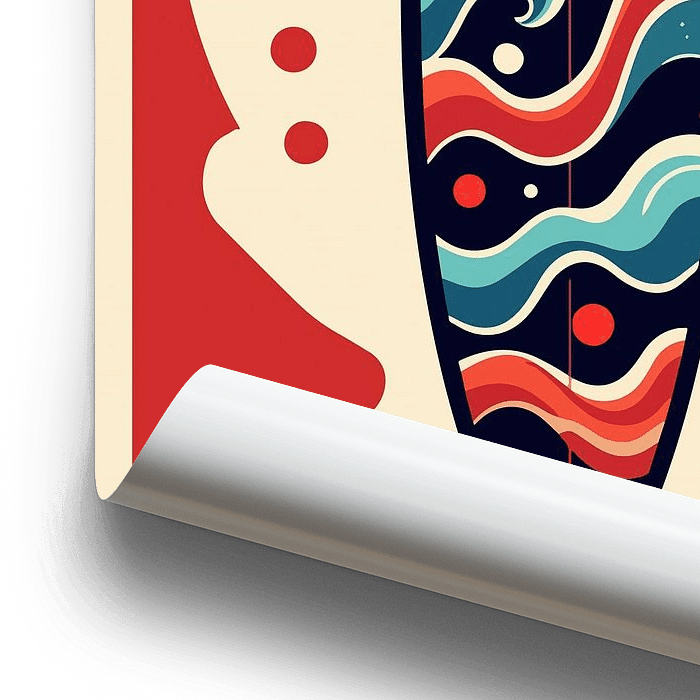 Ein Surfbrett tanzt im Farbenmeer, Wellen umspielen seine elegante Silhouette. Intensive Töne und lebendige Muster feiern die Freude des Surfens, die Freiheit des Wassers, Sonne, Kunst und die Magie der Surfgemeinschaft.