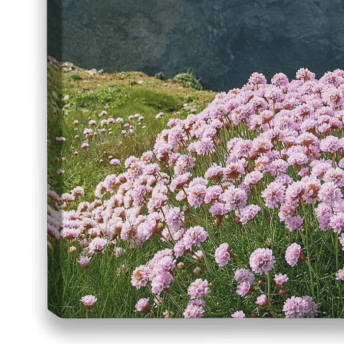 Küstenline von cornwall bei porthcothan besonders dekorativ durch die wundervollen pinken blumen im Frühling