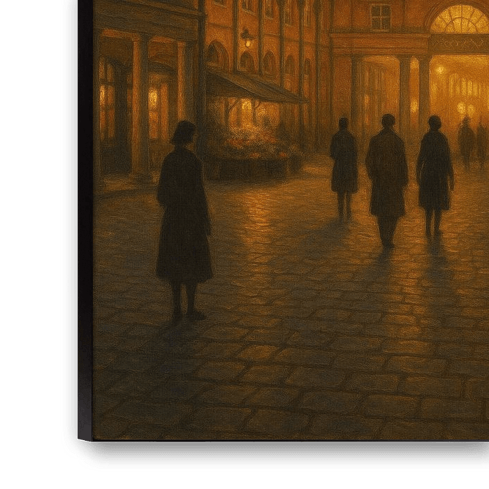 Die Komposition schafft ein Gleichgewicht zwischen Erhabenheit und Intimität. Die Figuren wirken klein unter dem hoch aufragenden Dach, doch jede Silhouette ist von stiller Präsenz. Das Licht streut über die Architektur und lenkt die Aufmerksamkeit auf den Rhythmus der Säulen, das Leuchten der Schaufenster und den fernen Schimmer des Marktinneren.