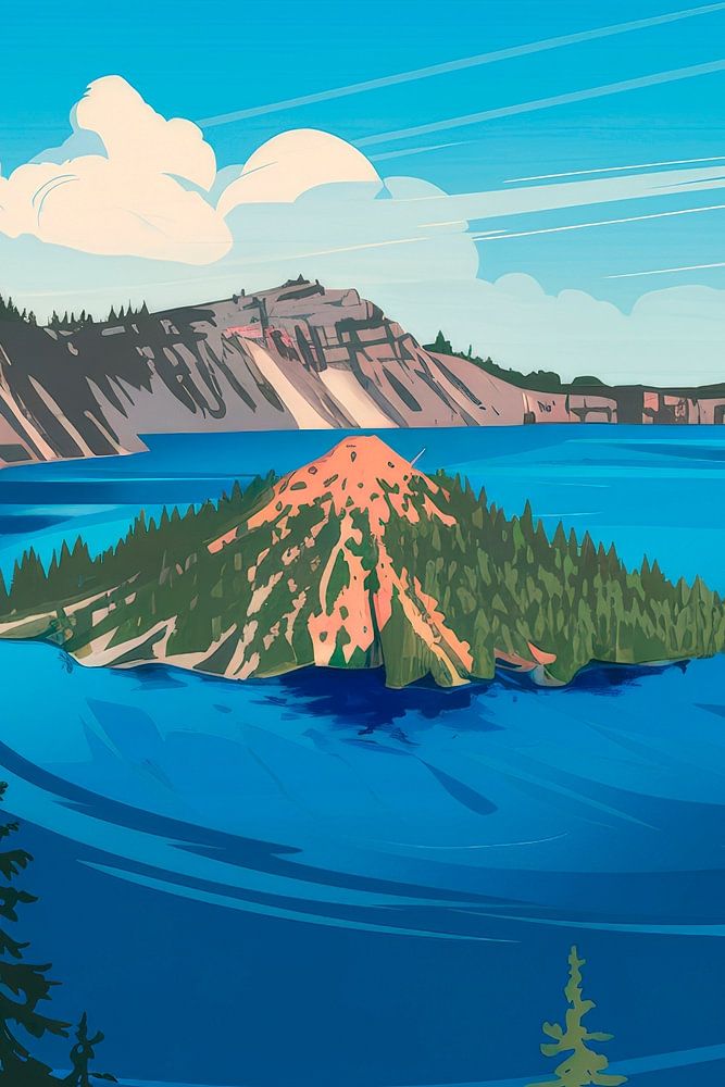 Ein strahlender Himmel umrahmt das tiefblaue Wasser des Kratersees, während sanfte Berge im Hintergrund elegant emporragen. Die lebhaften Töne der Natur bringen ein Gefühl von Ruhe und Abenteuer ins Leben. Perfekt für das Wohnzimmer, um eine entspannte Atmosphäre zu schaffen und die Schönheit der Natur ins Zuhause zu holen.