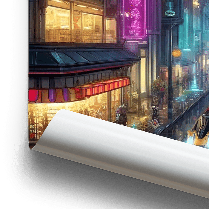 Erlebe die faszinierende Welt einer futuristischen Metropole mit diesem atemberaubenden Cyberpunk-Poster. Die detailreiche Szenerie einer neonbeleuchteten Stadt bei Nacht entführt Dich in eine Welt voller High-Tech, schwebender Autos und lebendiger Straßenszenen. Eine pulsierende…