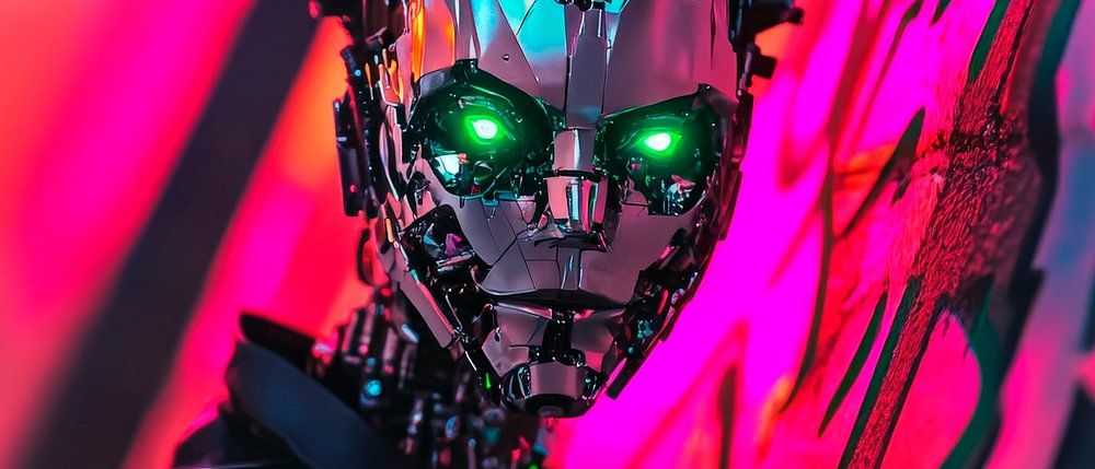 Eine futuristische Figur mit leuchtend grünen Augen und einem metallischen Gesicht sorgt für aufregende Akzente. Der Kontrast zwischen der kühlen Technologie und den warmen, lebhaften Farben der Umgebung schafft eine spannende Atmosphäre. Ideal für ein modernes Wohnzimmer oder ein kreatives Büro, wo Technik und Kreativität aufeinandertreffen.