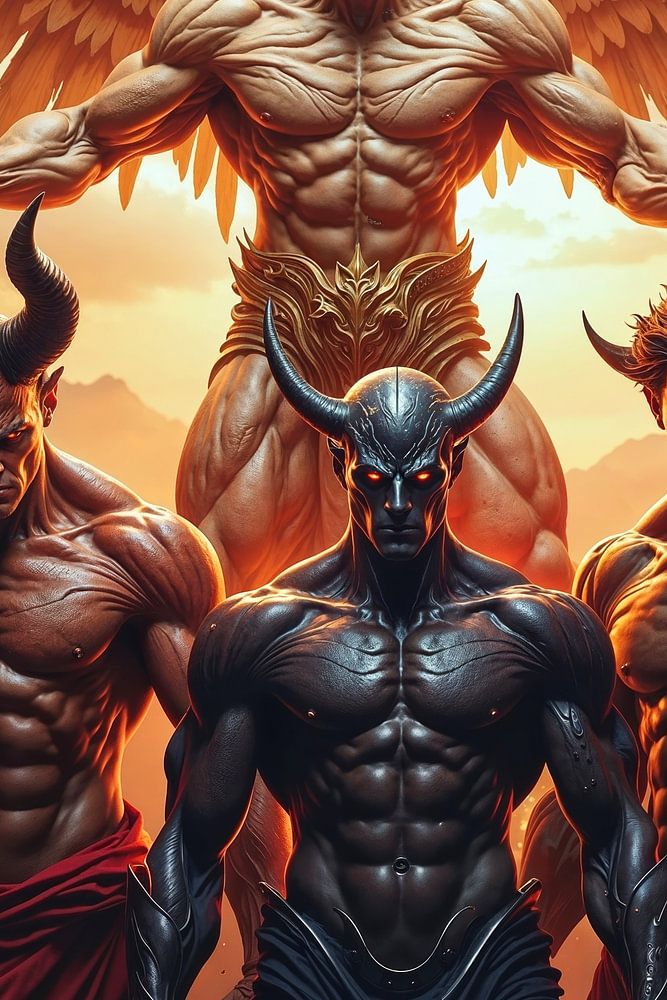 Zwischen Feuer, Rauch und zerklüfteter Landschaft erhebt sich Luzifer mit ausgebreiteten Flügeln über drei dämonische Krieger. Ihre Körper wirken wie aus Stein und Glut geformt, gespannt in absoluter Kontrolle, während das Licht des Himmels auf brennende Erde trifft. Die Szene zeigt einen Moment stiller Macht, kurz bevor sich das…