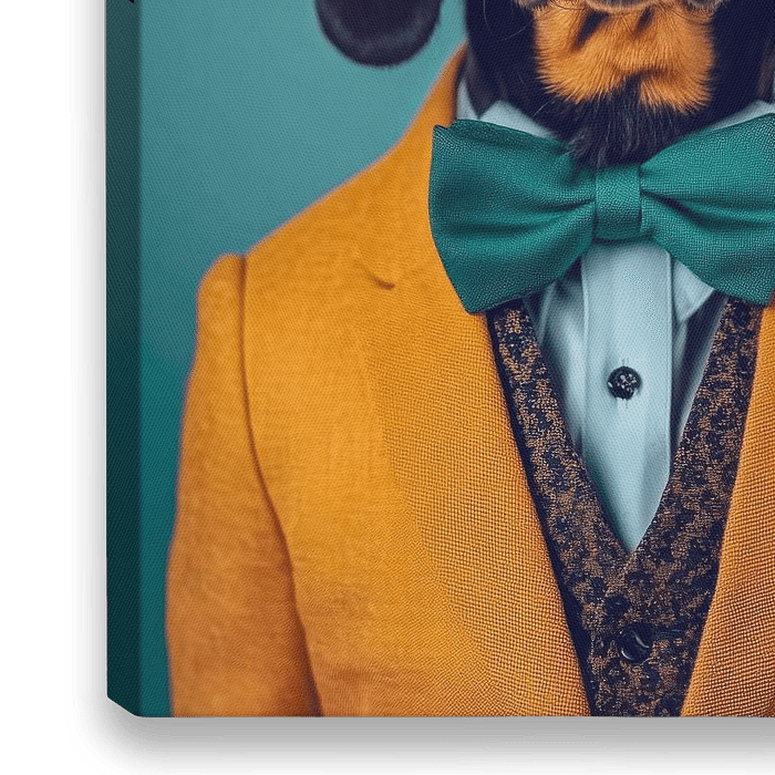 Ein charismatischer Dachshund präsentiert sich im edlen Outfit: ein leuchtend gelber Anzug mit eleganter Weste und einer grünem Fliege. Seine glänzenden, schwarzen Ohren und die warmen, braunen Augen strahlen eine Mischung aus Eleganz und Verspieltheit aus. Diese charmante Figur wirkt, als käme sie direkt aus einem Modekatalog für Hunde.