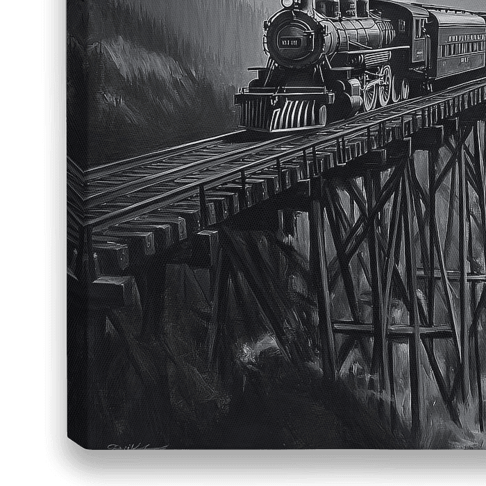 Ein dampfender Riese durchbricht die Stille der Berge, während er über das gewagte Gleis schwebt. Die Wolken laden sich schwer mit mystischer Energie, und der Dampf vermischt sich mit der kühlen Luft, als der Zug den Horizont erobert. Entschlossenheit und Abenteuer liegen in der Luft, bereit für die Reise ins Unbekannte.