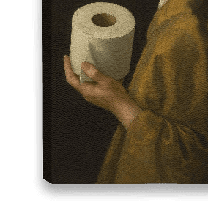 Ein geheimnisvolles Mädchen blickt über die Schulter, ihr strahlender Perlenohrring funkelt im Licht. Die sanften Farben und der unerwartete Rollentausch des Toilettenpapiers laden zur Reflexion und zum Schmunzeln ein. Perfekt für ein modernes Wohnzimmer, bringt es einen Hauch von Kunst und unkonventionellem Humor in den Raum.