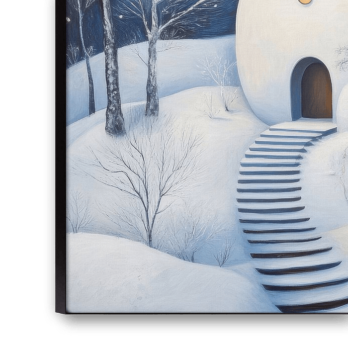 Ein fantastisches Haus in Form eines Schneemanns steht in einer verschneiten Landschaft. Das Gebäude verfügt über Fenster, eine Treppe und eine Karottennase und fügt sich nahtlos in die winterliche Umgebung ein.