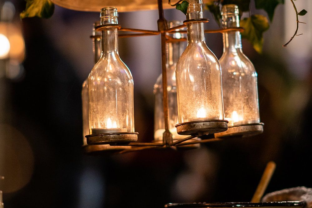 Vintage gedeckter Tisch mit alter dekorativer Flaschenlampe während eines Theaterstraßenfestes. Alte Retro-Töpfe und Pfannen mit Kerzenlicht zur Dekoration eines Dickens-Events.