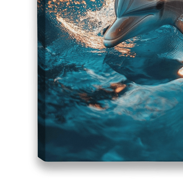 Ein spielerischer Delfin springt geschickt durch glitzernde Wellen, während die goldene Abendsonne das Wasser in warme Töne taucht. Diese dynamische Szenerie bringt lebendige Bewegung und eine entspannte Atmosphäre in jedes Wohnzimmer. Ideal für alle, die die Freude und Lebhaftigkeit der Meereswelt schätzen, sorgt dieses Bild für positive Stimmung und ein Gefühl von Freiheit.