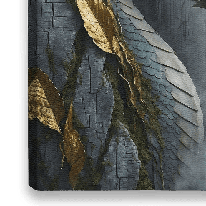 Breath Behind Gilded Bark zeigt einen mythischen Drachen, der sich langsam aus dem Nebel befreit und dessen Körper sich mit der Rinde eines uralten Baumes verflochten hat. Zwischen goldenen Blättern, aufplatzender Rinde und sich windenden Wurzeln entfaltet sich sein schimmernder, schuppiger Körper - wie ein Geflüster uralter…