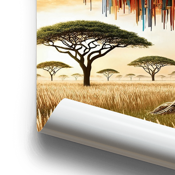 Dieses außergewöhnliche digitale Poster zeigt einen imposanten Baum, dessen Krone nicht aus Blättern, sondern aus Hunderten von Büchern besteht. Die Seiten und Buchrücken formen eine dichte, beeindruckende Struktur, die im goldenen Licht eines afrikanischen Sonnenuntergangs erstrahlt. Inmitten einer weiten Savannenlandschaft mit vereinzelten Akazien symbolisiert dieser Baum das Wissen, das über Generationen hinweg gewachsen ist – eine Hommage an Bildung, Kreativität und die unendlichen Möglichkeiten der Literatur.