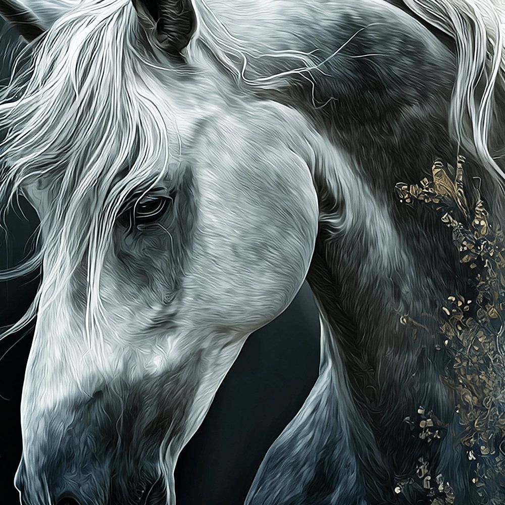 Mysteriöses und majestätisches Porträt eines weißen Pferdes mit flatternder Mähne und dezenten Goldakzenten vor dunklem Hintergrund, ideal als zauberhafte Wanddekoration.
