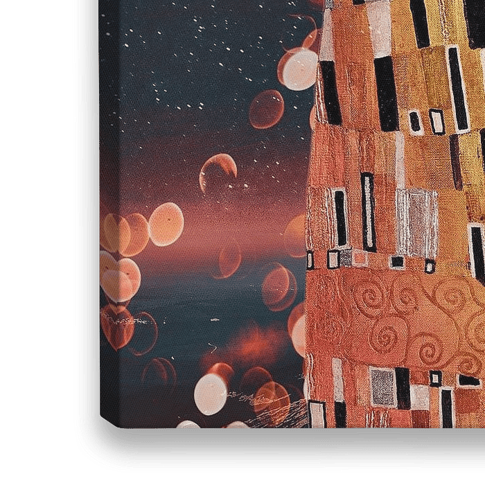Bestelle dieses abstrakte Wandbild Der Kuss im Abendlicht, nach einem Werk von Gustav Klimt, Jugendstil - digitale Collage von MadameRuiz als Reproduktion auf Leinwand, Alu-Dibond, als Poster, Fototapete oder Acrylglasbild.
