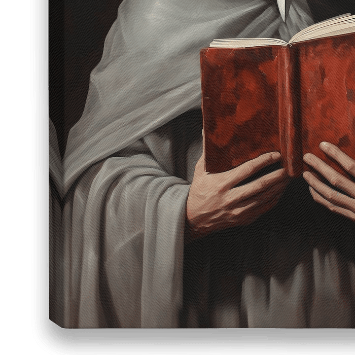 Klassisches Porträtgemälde eines mittelalterlichen Ritters, der ein Buch liest.