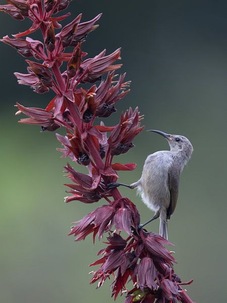 Dieses atemberaubende Diptychon fängt die Essenz der südafrikanischen Flora und Fauna ein, fotografiert im berühmten botanischen Garten von Kirstenbosch. Die Serie zeigt sowohl den männlichen als auch den weiblichen Malachit-Honigfresser, die sich auf den tiefroten Blütenkelchen einer Wildblume ausruhen.