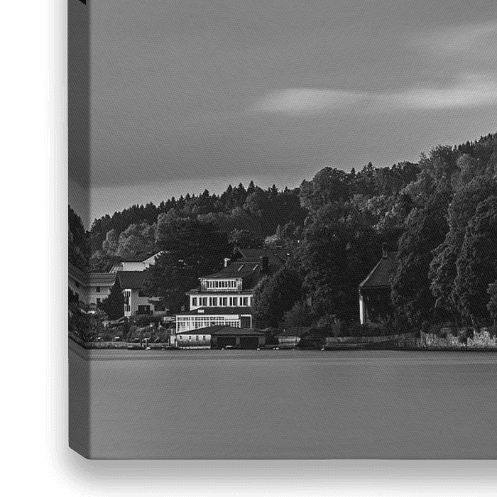 Ein Schwarz-Weiß-Foto von einem Sommerabend in Tegernsee, einer Stadt in Bayern am Tegernsee. Am Tegernsee steht die ehemalige Klosterkirche von St. Quirin.