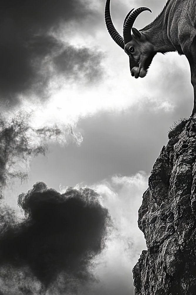 Auf einem steilen Felsen, als Hüter der Berge, thront majestätisch ein imposanter Steinbock. Seine kräftigen Hörner ragen stolz in den bedrohlichen Himmel, wo dunkle Wolken eine dramatische Kulisse schaffen. Der Kontrast zwischen dem satten Schwarz und den schimmernden Grautönen verleiht der Szene eine eindringliche Atmosphäre von Stärke und Wildheit.