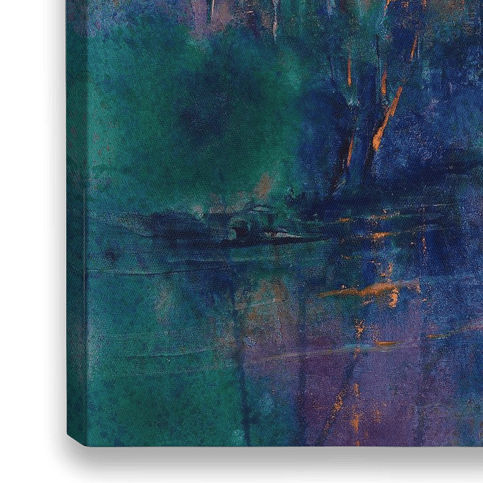Dieses faszinierende, abstrakte Landschaftsgemälde entführt den Betrachter in eine mystische, traumgleiche Welt, die durch den Titel "The Wood of Forgotten Fables" eine tief poetische Bedeutung erhält.