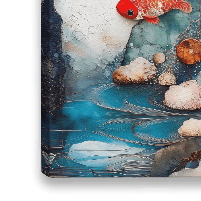 Ein fantasievolles Bild mit einem leuchtend roten Koi-Fisch, der in einer surrealen Wasserlandschaft schwimmt.
