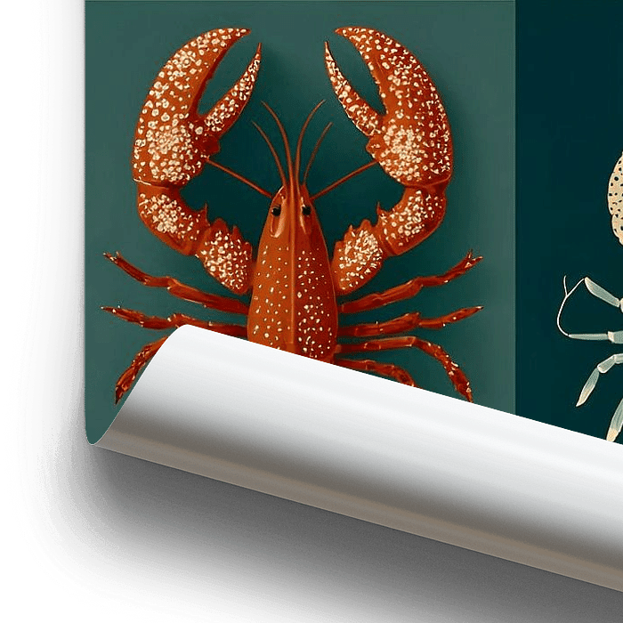 Eine streng rasterartige Komposition zeigt Hummer und Muscheln in acht Feldern, jeweils farblich variiert in gedeckten Grün-, Blau- und Sandtönen mit punktuellen Rotakzenten. Die Objekte sind stilisiert, fast ornamental, mit klaren Konturen und flächiger Schattierung. Die Wiederholung erzeugt Ordnung und Rhythmus, während die…