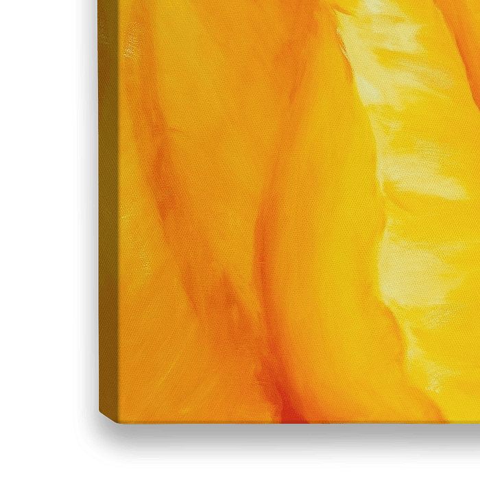 Detail einer gelben Rose ist ein Acrylgemälde auf Leinwand im Querformat gemalt von der Künstlerin Karen Kaspar. Es zeigt die inneren Blütenblätter einer wunderschönen Rosenblüte in leuchtenden Gelb- und Orangetönen.