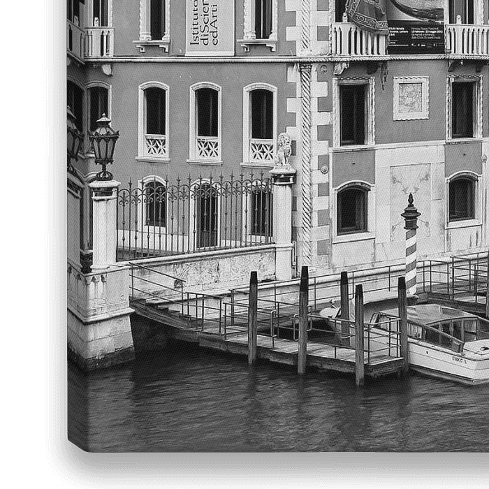 Ein Schwarz-Weiß-Foto von einem Abend in Venedig mit Blick auf die Brücke Ponte dell'Accademia mit ihrem ikonischen Blick auf den Canal Grande, Italien.