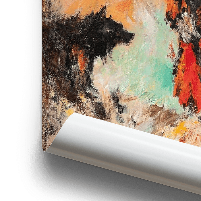 Bestelle dieses abstrakte Wandbild Die Geschichte des Wolfs, des Fuchses und des Jägers. Acryl auf Leinwand von Galerie Ringoot als Reproduktion auf Leinwand, Alu-Dibond, als Poster, Fototapete oder Acrylglasbild.