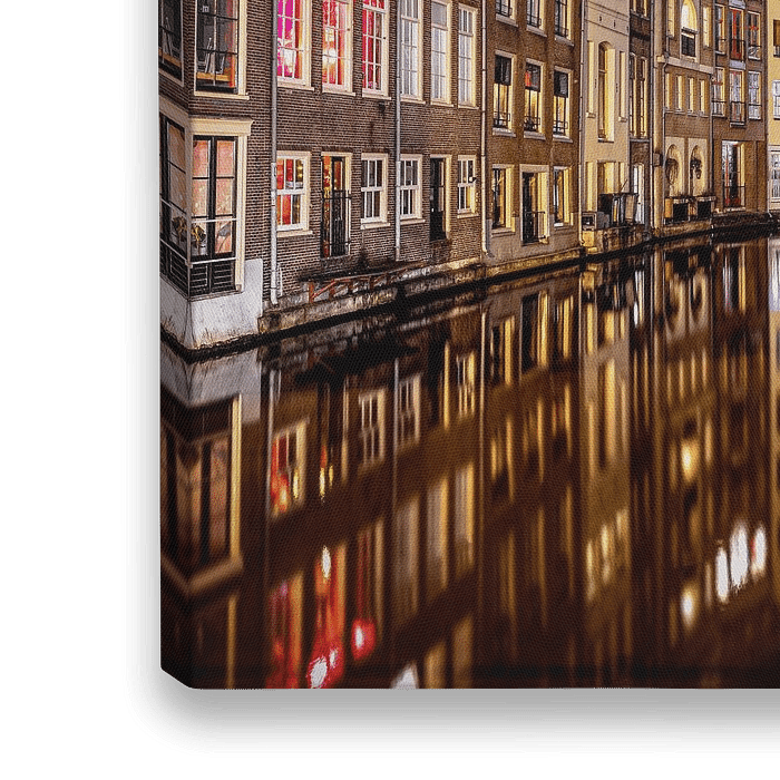 Einer der schönsten Orte in Amsterdam und ein kleines Venedig. Der Oudezijdsvoorburgwal in Amsterdam bei Nacht mit seiner atmosphärischen Spiegelung im Wasser und übertriebenen Wolken.