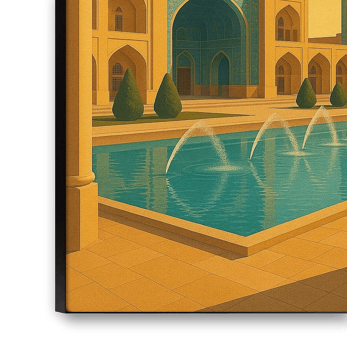 Versetzen Sie Ihr Zuhause mit diesem lebendigen Reiseposter von Isfahan in das Herz des Safawidenreiches. Die Stadt, die historisch als "Nesf-e-Jahan" (die Hälfte der Welt) bekannt ist, wird hier durch ihre ikonische blau gekachelte Architektur gefeiert. Das Kunstwerk zeigt eine beeindruckende Moscheekuppel und ein Minarett in satten…