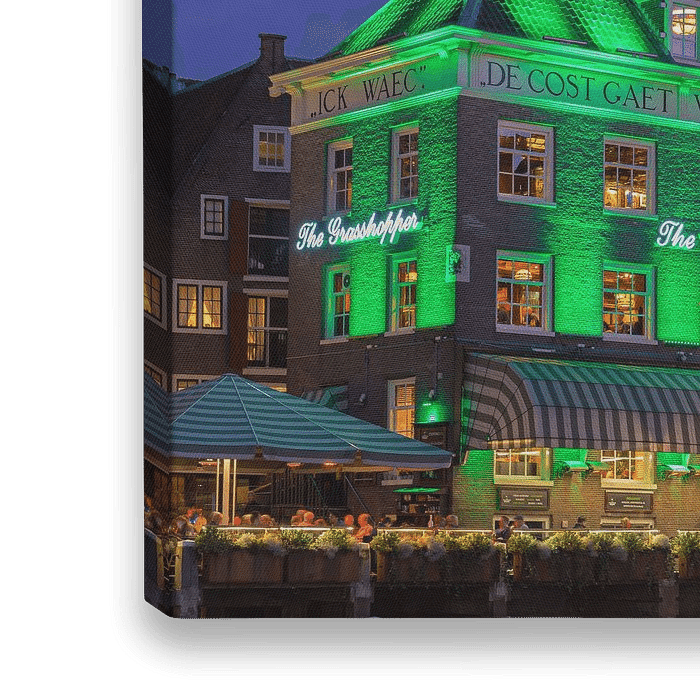 Ein Abend in Amsterdam mit Blick auf The Grasshopper und die Alte Kirche im Hintergrund, das älteste Gebäude Amsterdams.