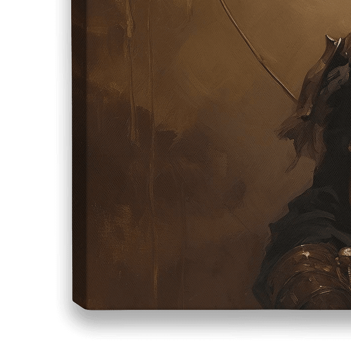 The Cat General - Ein fesselndes Porträt einer majestätischen Katze mit menschlichen Zügen, die in eine detaillierte Rüstung gehüllt ist, die an historische europäische Krieger erinnert. Der Hintergrund in sanften Erdtönen bietet eine subtile Leinwand, die den Fokus auf die Katze und ihre Rüstung lenkt. Das Ganze hat ein stattliches und…