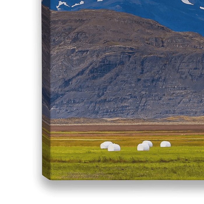 Ein horizontales 16:9-Foto von verpackten Heuballen an der Südküste Islands in der Nähe der Stadt Hofn, mit einem kleinen Gletscher im Hintergrund, der Teil des Vatnajokul-Nationalparks ist.