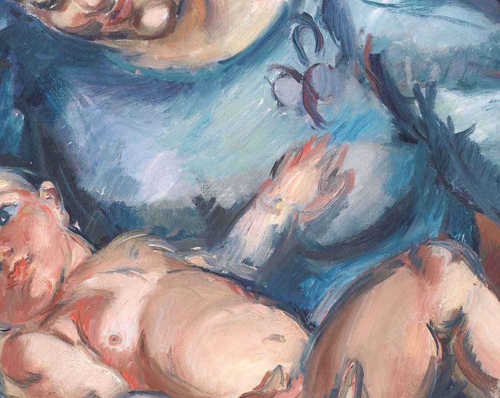 Diese Mutter schaut liebevoll auf ihr Kind, ein übergroßes Baby, das nackt in ihren Armen liegt.