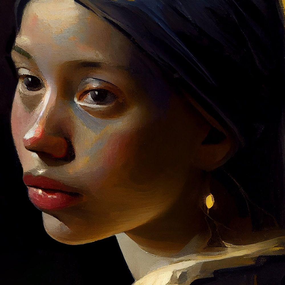 Das Mädchen mit dem Perlenohrring, eine Variation im Stil der alten Meister, nüchtern und zugleich leuchtend. Das Licht wurde auf sublime Weise eingesetzt. Geeignet für verschiedene Stile und Trends.