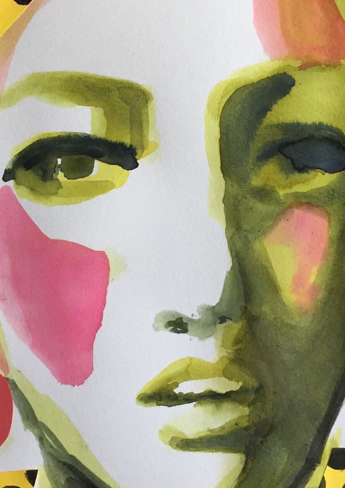 Moderne und farbenfrohe Collage, die mit Ecoline, Tusche und Stücken von farbigem Papier hergestellt wurde. Teil einer Serie von Modeillustrationen, Mischtechnik. Mit dem Fließen der Ökoline und der Grafik der Stecklinge versuche ich, zusätzliche Dimension und Struktur zu schaffen.