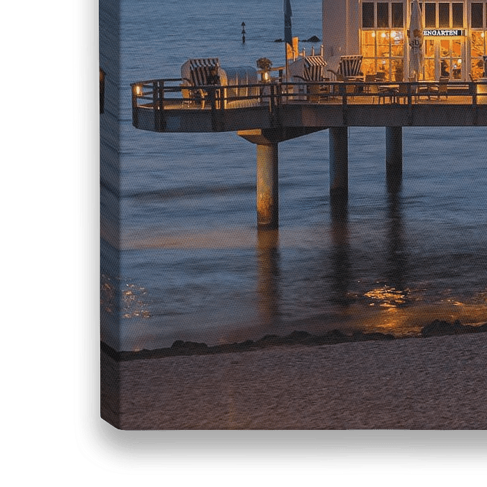 Sonnenuntergang an der Seebrücke Sellin im Ostseebad Sellin auf der deutschen Insel Rügen. Am Pier gibt es ein Restaurant in Strandnähe über dem Wasser und eine Tauchgondel.