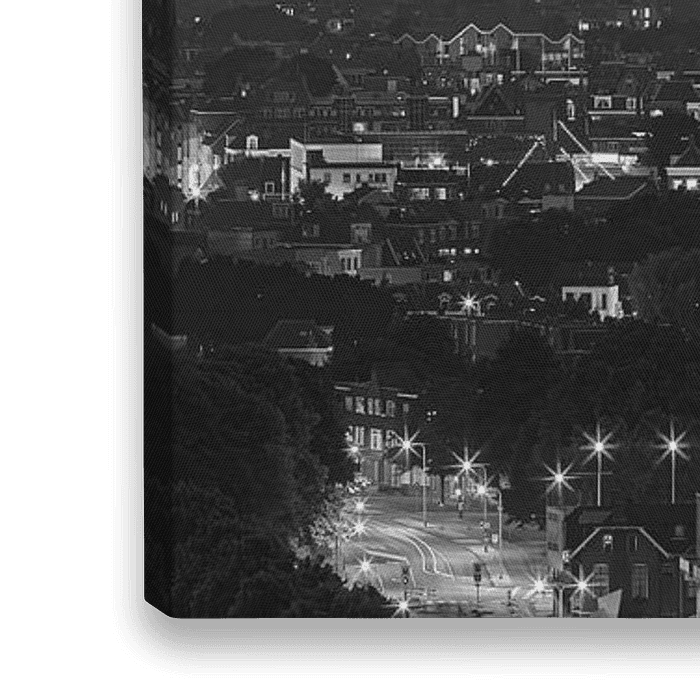 Ein 3:1-Panoramafoto in Schwarz-Weiß eines Abends mit der Skyline der Stadt Groningen und Ansichten des Stadtzentrums mit den Martinitoren, die das Bild pontisch ausfüllen.