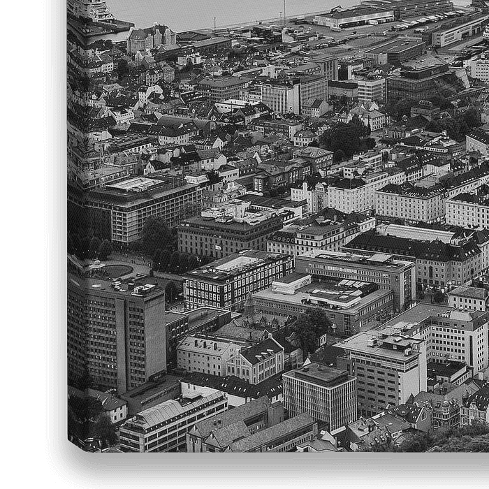 Ein schwarz-weißer Sonnenuntergang vom Berg Floyen über der Stadt Bergen (historisches Bjørgvin) in der Provinz Hordaland an der Westküste Norwegens.