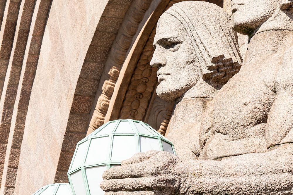 Die beiden Laternen in Form von stilisierten Kugeln, die von riesigen Statuen auf beiden Seiten des Haupteingangs gehalten werden. Diese Statuen werden häufig von der staatlichen Eisenbahngesellschaft Valtion Rautatiet in Werbespots und Anzeigen verwendet.