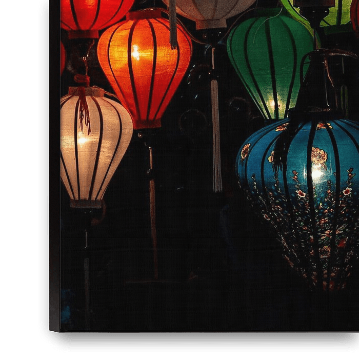 Bunte Laternen in der authentischen Stadt Hoi An, Vietnam. Schöne Muster und bunte Stoffe erhellen die Nacht. Kultur- und Reisefotografie.