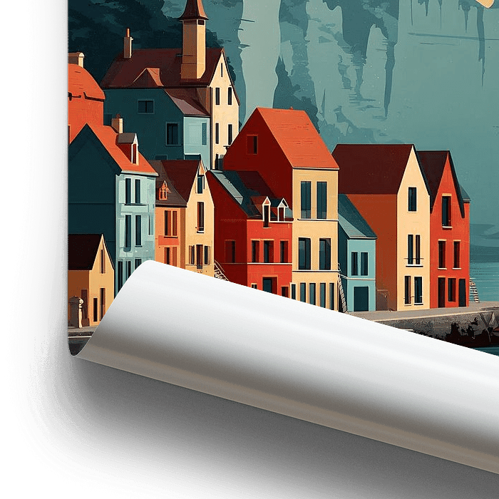 Vor der Kulisse imposanter weißer Klippen schmiegt sich der malerische Ort Étretat an die Küste der Normandie. Das Meer glitzert in sattem Blau, während die berühmten Felsbögen majestätisch aus dem Wasser ragen. Im Stil eines minimalistischen Retro Reiseplakats fängt das Motiv die zeitlose Eleganz und den Charme des Ortes ein: Sanfte…