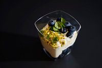 Doppelrahm-Frischkäse-Dessert mit frischen Heidelbeeren in Gläsern angerichtet